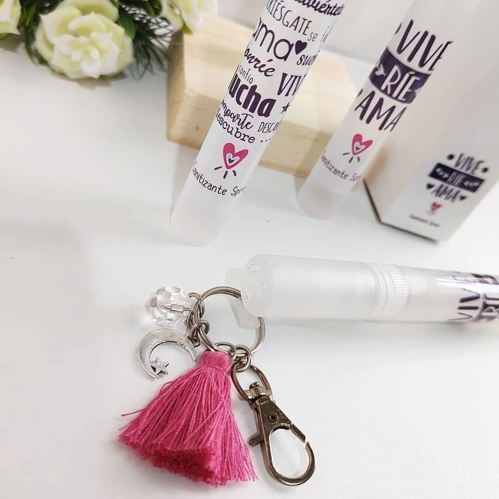 sanitizante lapicera con colgante frases varias y caja. por unidad.